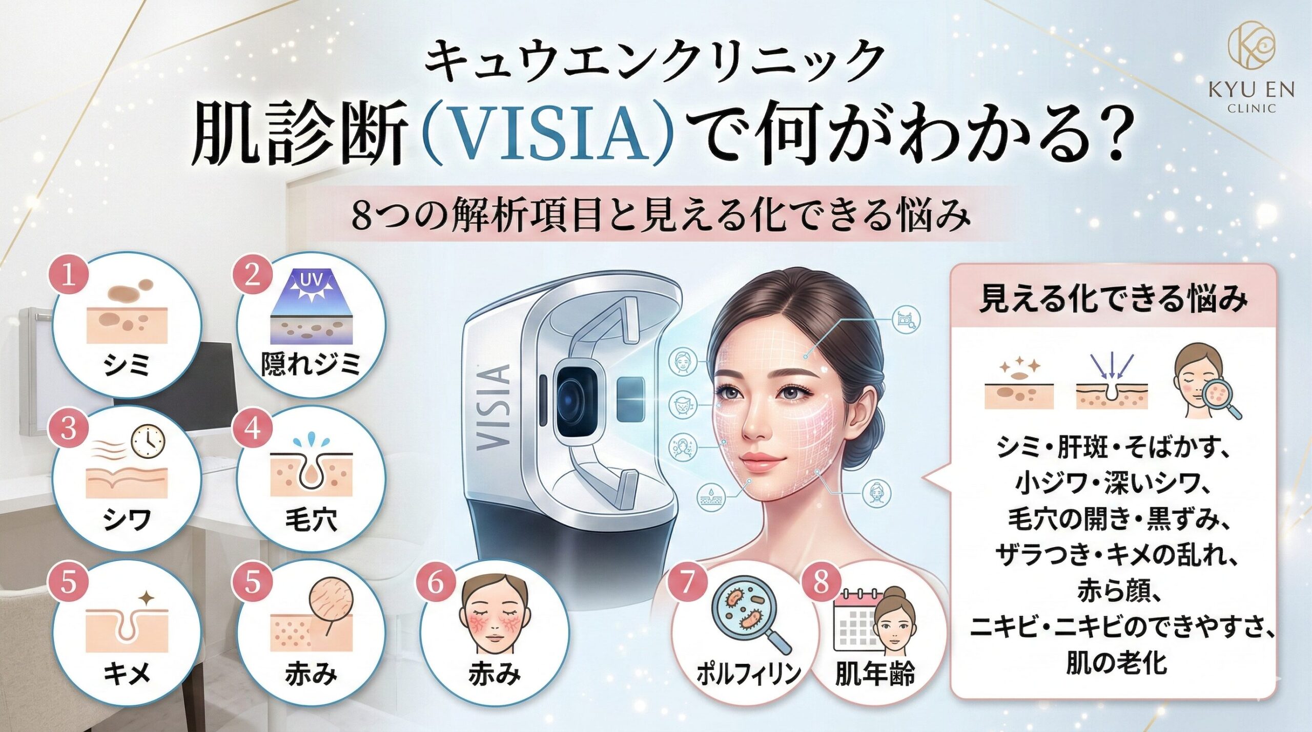 だからこの記事では、キュウエンクリニックの公開情報にある範囲で、VISIAで見られる8項目・料金の違い・当日の流れを、予約前に迷わない形に整理します。